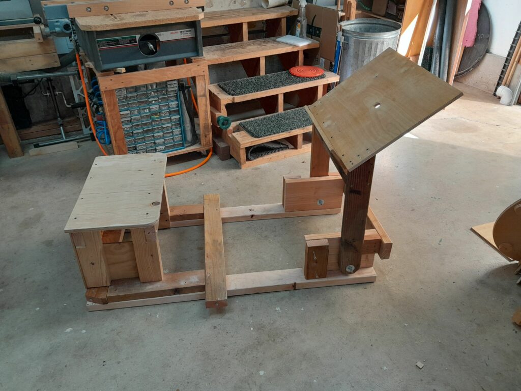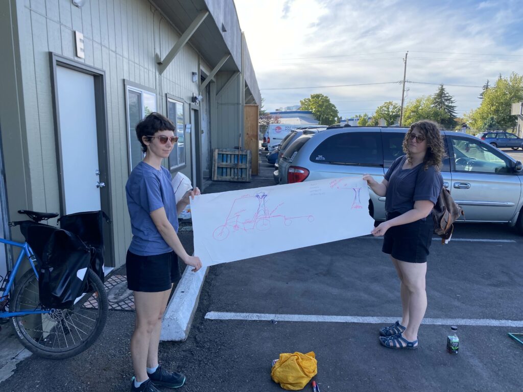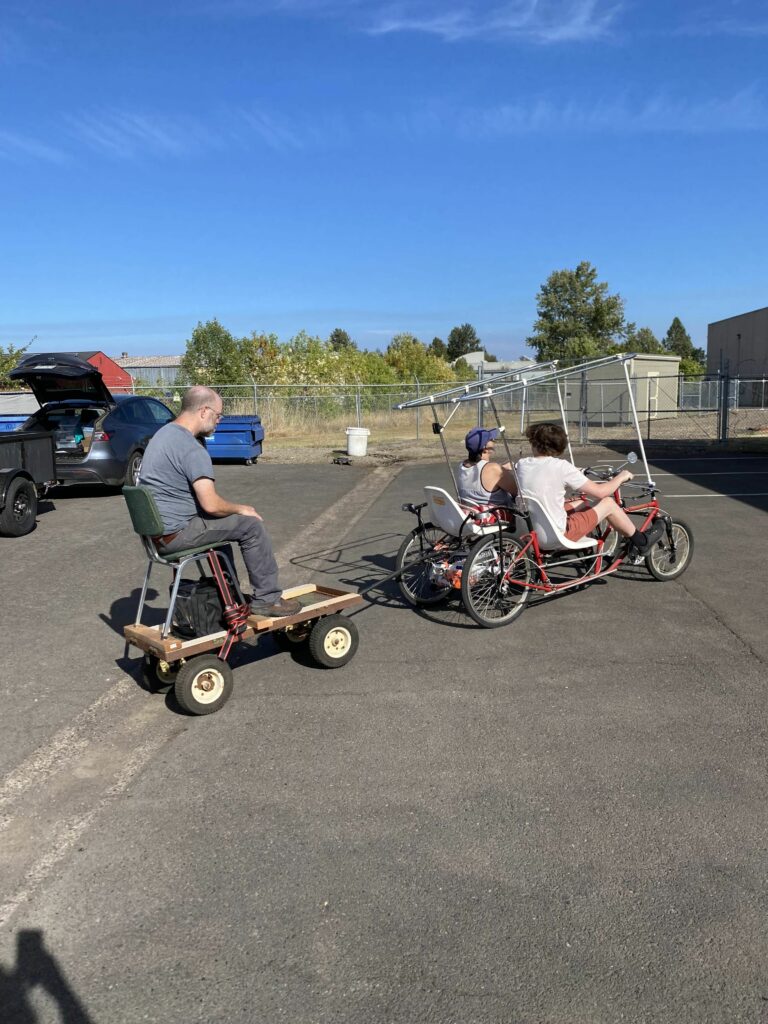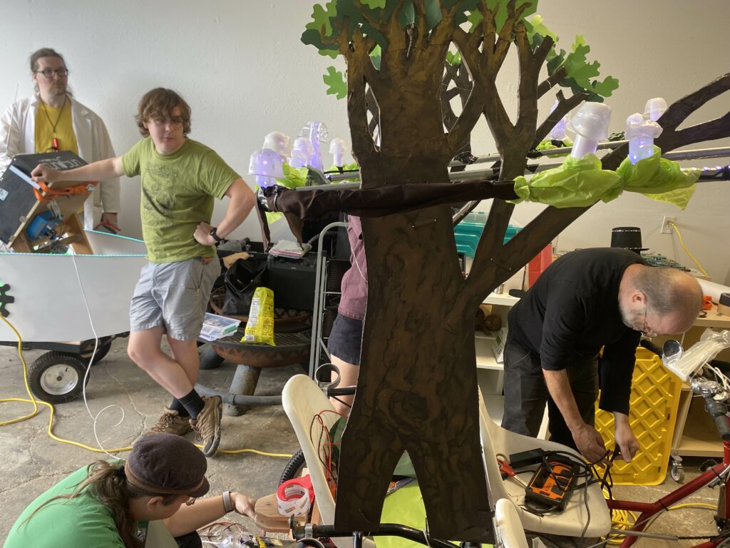 For our own entry, the crew worked out of Mark Davis’s Westish shop where we decorated a side-by-side tandem recumbent quadracycle (two bikes bolted together side by side) and attached a trailer to it. Taper provided music on his custom modular synth rig, and would be pulled in the back of the cart we found on Craigslist. Chris built a wood bench-and-lectern that Taper would sit in that fit perfectly in the cart, and we began decorating it. Suzi and Ada had a really fun idea with local natural themes so we decked out the bike with trees and mushrooms and the trailer would be vaguely-boat-shaped as we pulled it past the Willamette.