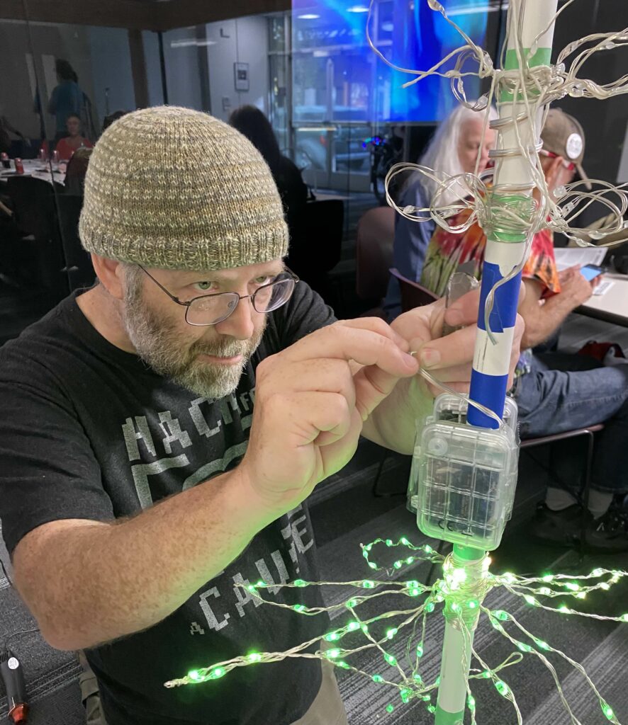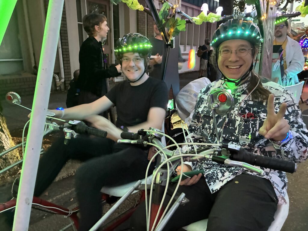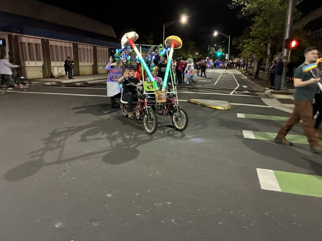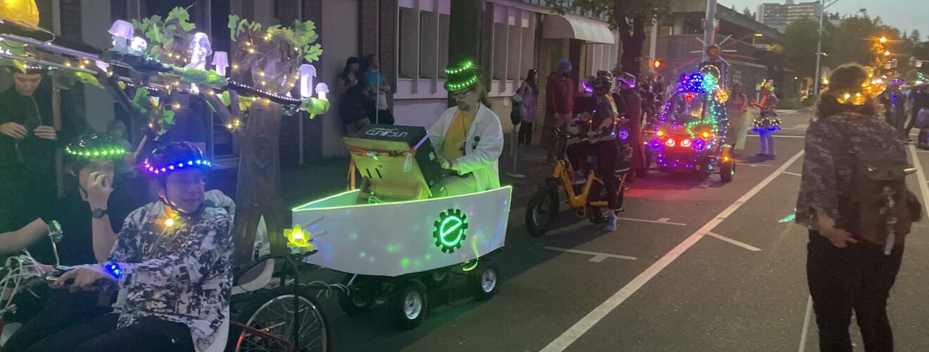 This year we partnered up with Eugene BRiGHT Parade, a celebration of all the things that make Eugene wonderful — illuminated and in motion. A revival of the Eugene Celebration and EUG Parade, the event brings together creative and community groups throughout the city, lights us all up, and sends us on a parade through downtown. Any foot- hand- or electric- powered entries are welcome, and we decided to build a bike-powered float.