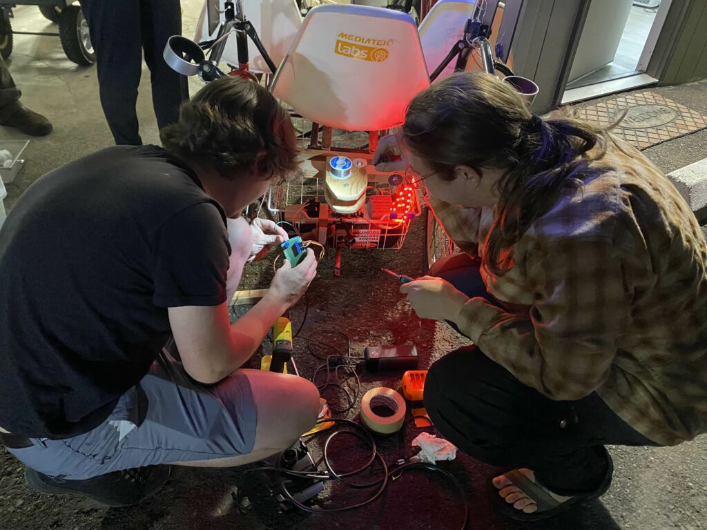 We made the lights on the cycle react to the music. Ryan and Taper developed a system where Taper’s eurorack module could control the red, blue, and green LEDs of LEDs mounted on the bike using a custom circuit box and Arduino system. Chris found some really slick VU meter units that would light up some mushrooms that were on the front of the bike. Both of these went through a little blue box that Taper put together to wire in to his synthesizer.